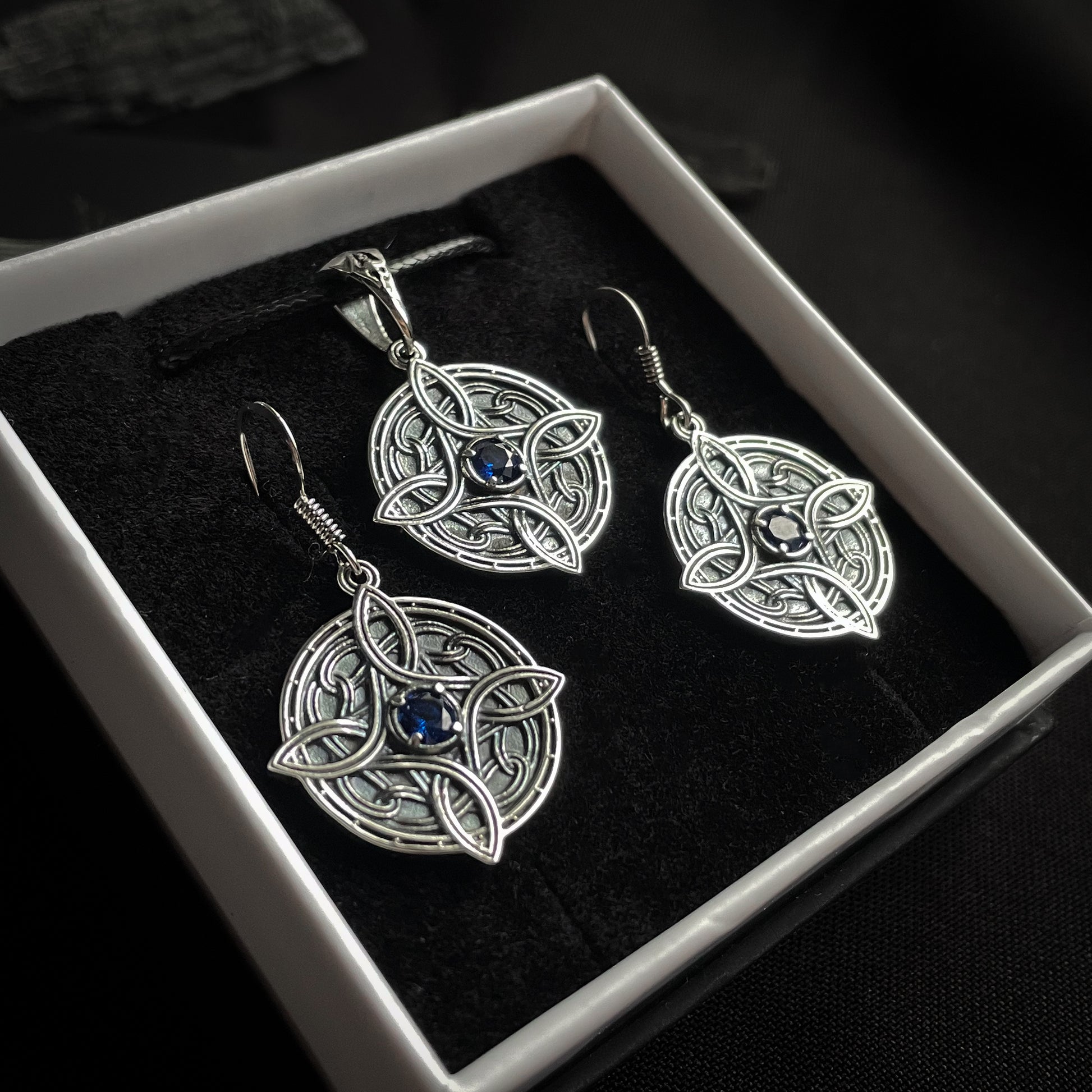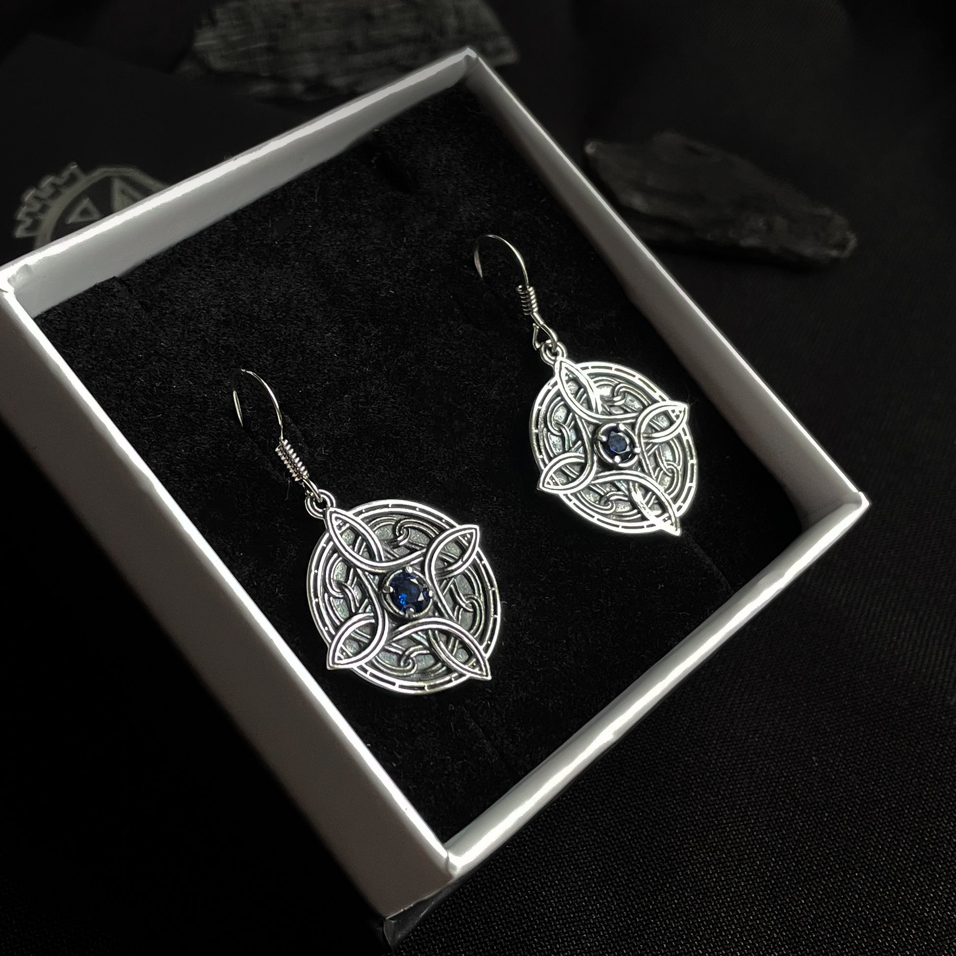 Elegant and symbolic, these earrings echo the intricate beauty of our miniature divine amulet design. Each piece features flowing Celtic knotwork surrounding a sparkling gemstone, available in several colors to match your style or personal meaning.