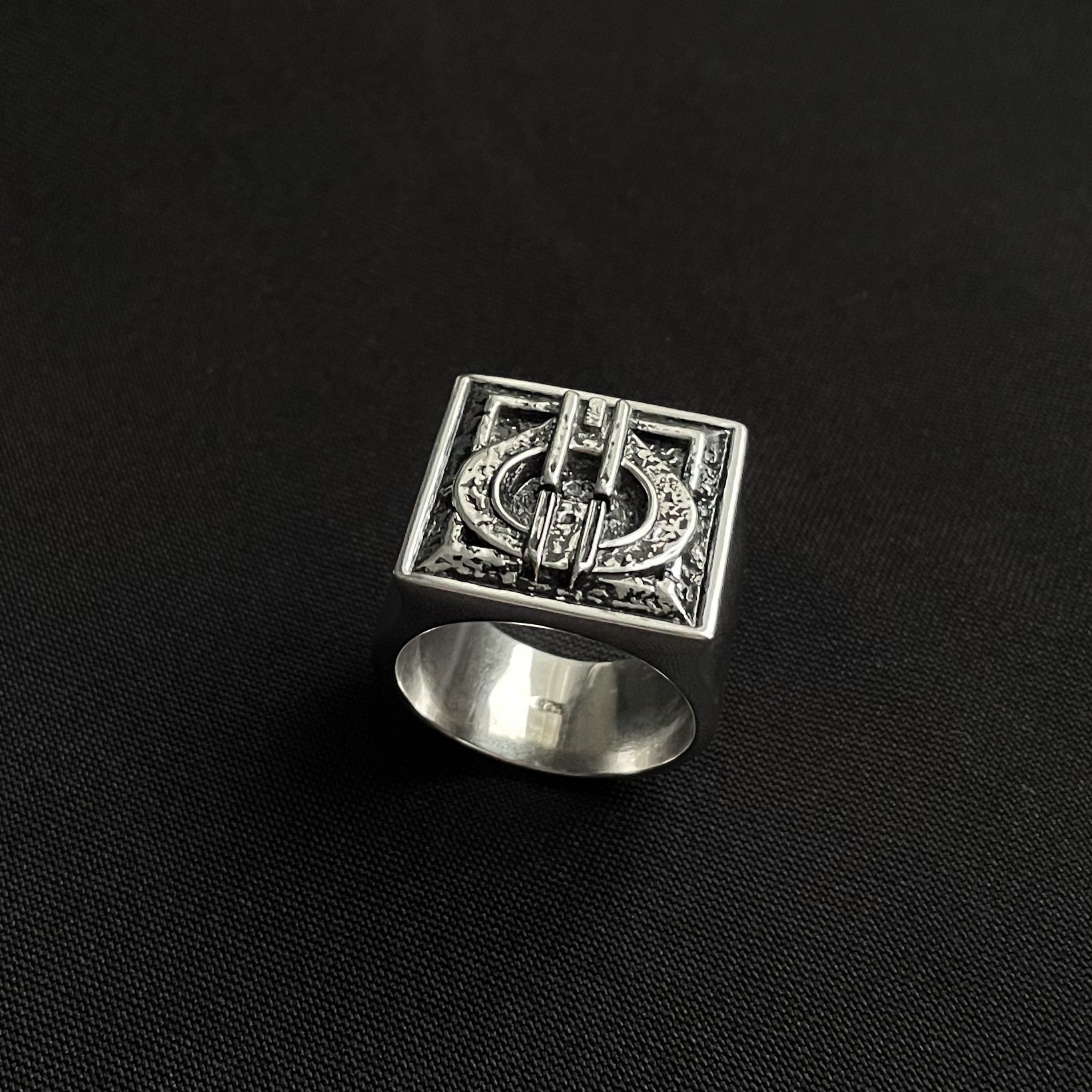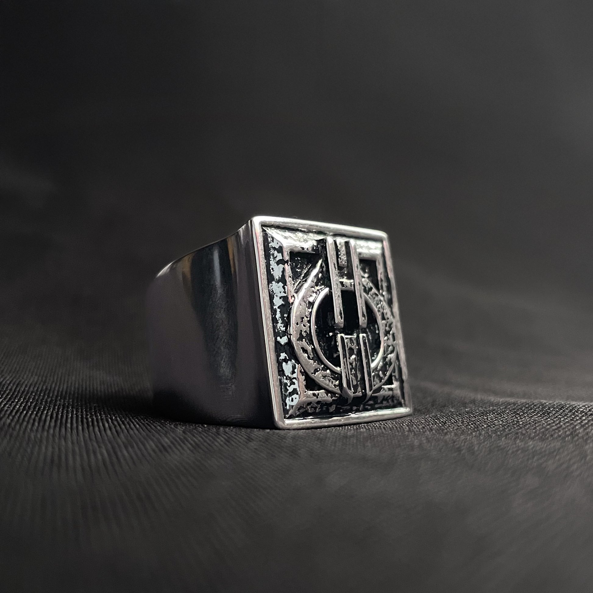 Meticulously handcrafted from solid 925 sterling silver, the ring features a bold geometric emblem framed within a textured background and accented with black enamel to enhance its depth and contrast.